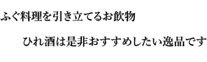 福姫のひれ酒は、奈良豊澤酒造の純米酒の「黒松貴仙寿」との酒を使用しています。但馬杜氏伝統の技と心で醸す手造りの純米酒で、香り高くすっきりとした飲み口の酒を造り出しており、最高のひれ酒となります。