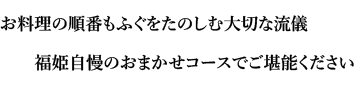 福姫おすすめのおまかせコースは一人様 4,800円からご用意いたしております。 「福」コースは湯引き 、てっさ 、てっちり 、雑炊 、デザートと充実の内容で4,800円。お気軽にふぐ料理を楽しんでいただけます。